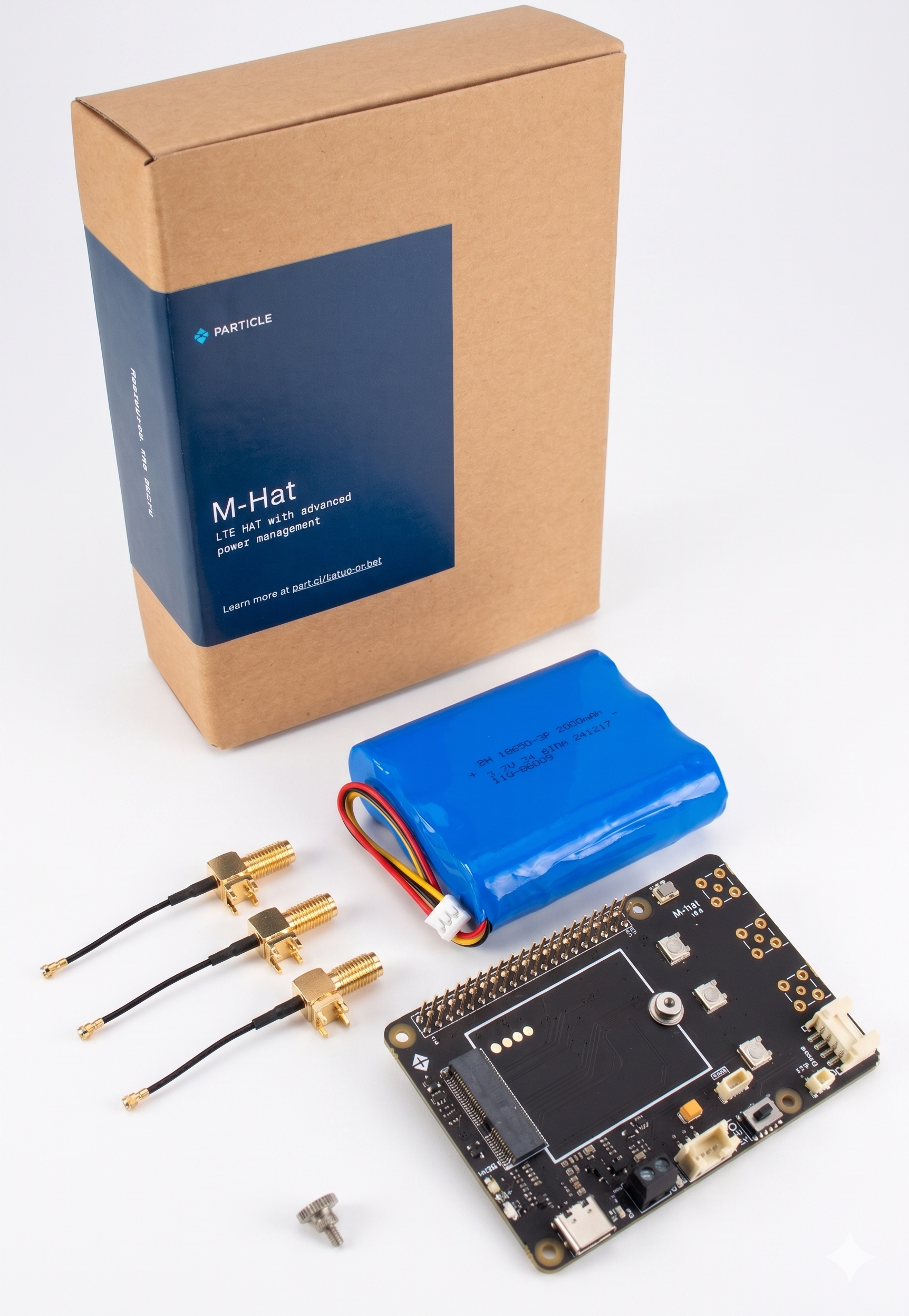 M-Hat boardThe main Particle HAT boardCarrier board for the Particle SoM. Provides cellular connectivity and power management for your Raspberry Pi